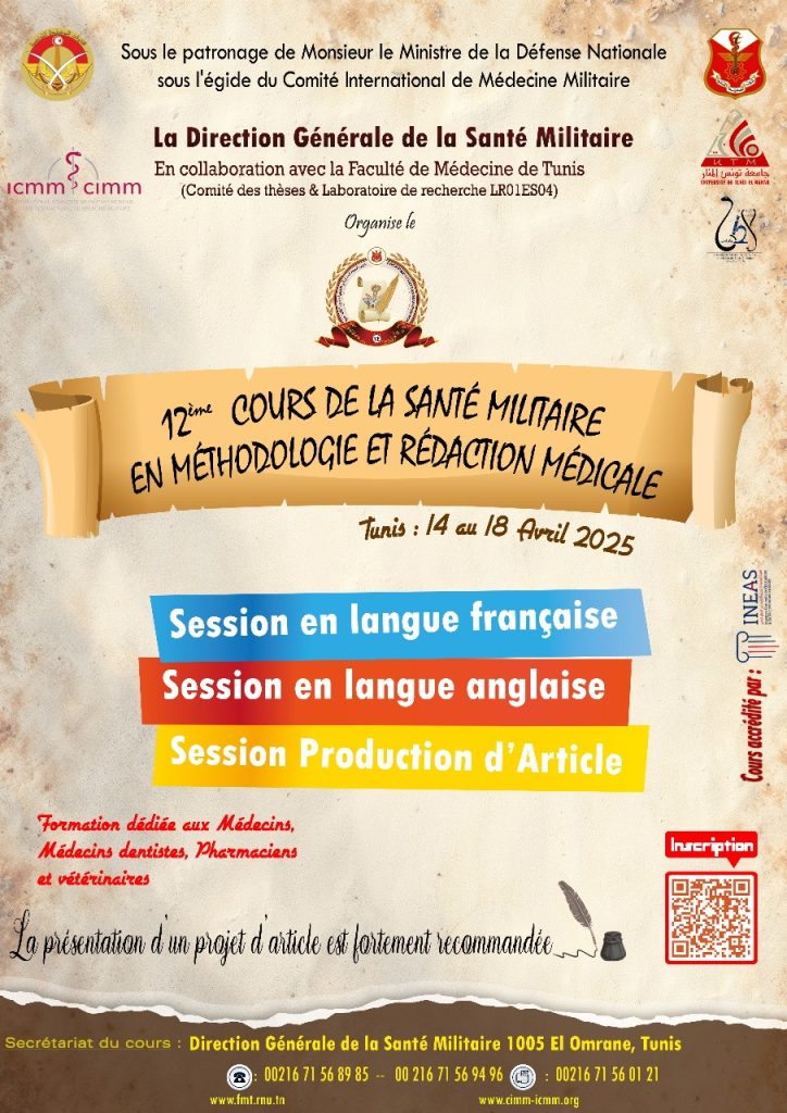 La direction générale de la santé militaire en collaboration avec la faculté de médecine de Tunis organise les 12ème cours de la santé militaire en méthodologie et rédaction médicale. Ces cours auront lieux du 14 au 18 Avril 2025