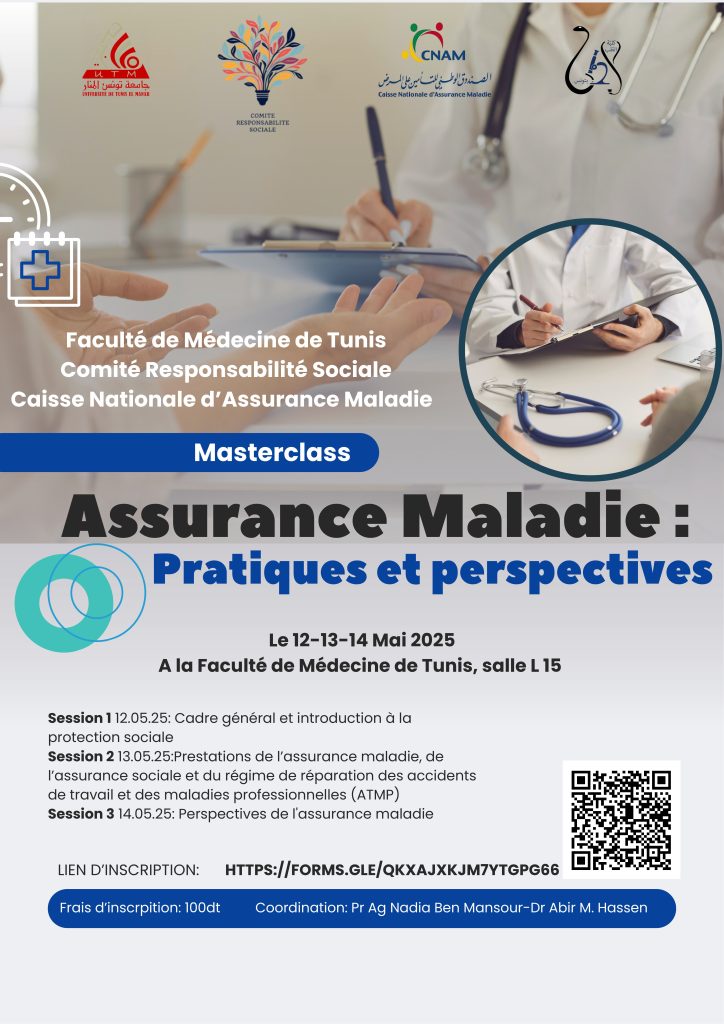 15 Avr Assurance Maladie : Pratiques et perspectives Publié à 17:59h in Actualités, Masterclass avr/Jui par FMT Share La Faculté de Médecine de Tunis et la Caisse Nationale d’Assurance Maladie organisent une masterclass intitulée : Assurance Maladie : Pratiques et perspectives. Affiche-MC-AM2.pdf Download File View Fullscreen ×