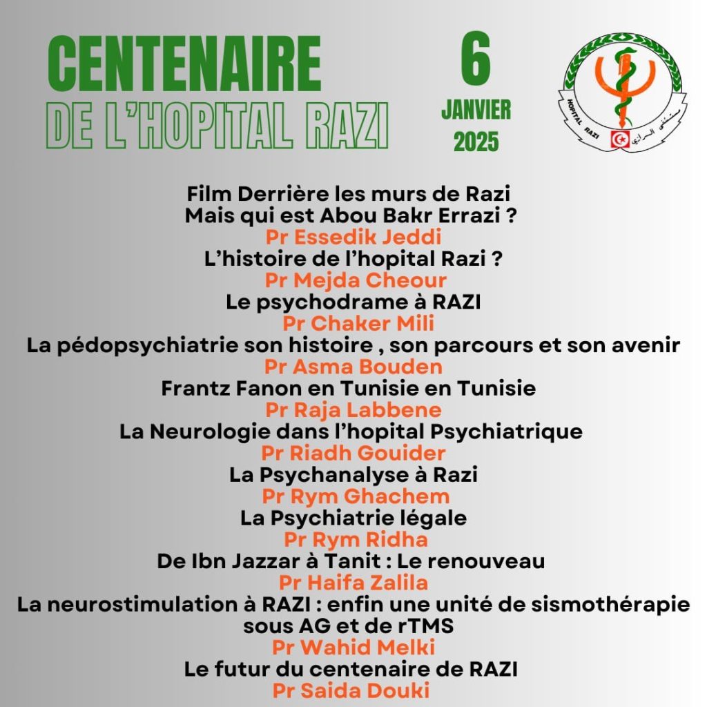 03 Jan Centenaire de l’hôpital Razi Publié à 17:16h in Actualités, Evènement par FMT Share Le 06 Janvier 2025 l’hôpital Razi organise une journée scientifique pour célébrer son centenaire
