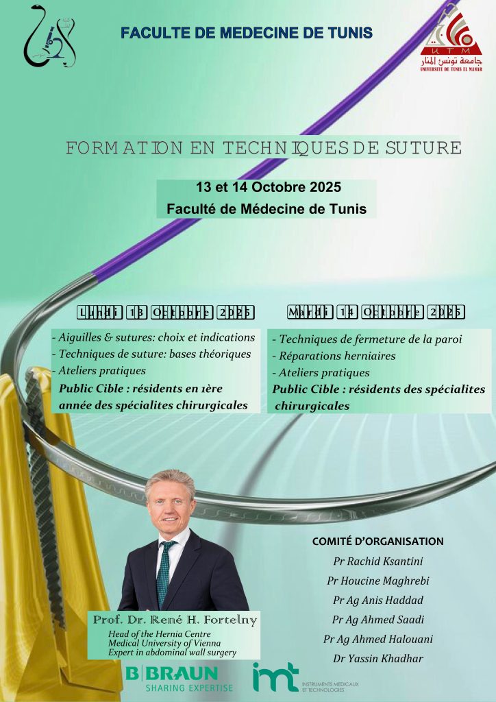 • 14 octobre 2025 : Formation théorique et pratique sur les techniques de réparation herniaire et de fermeture pariétale, destinée aux résidents de 2e, 3e, 4e et 5e années.