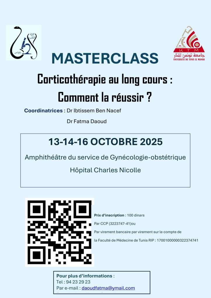 La faculté de médeiince de Tunis organise une masterclass intituée : Corticothérapie au long cours: comment la réussir?