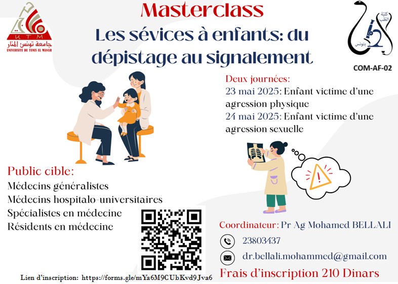 05 Mai Masterclass : Les sévices à enfants Publié à 12:41h in Actualités, Masterclass avr/Jui par FMT Share La faculté de Médecine de Tunis organise une masterclass intitulée « Les sévices à enfants : du dépistage au signalement ». Les inscriptions se font en scannant le QR code