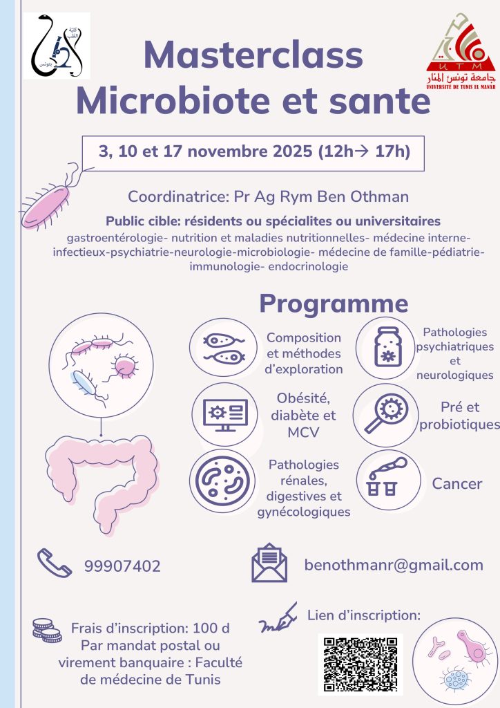 20 Août Masterclass : Microbiote et santé Publié à 11:37h in Actualités, Evènement, Masterclass sep/nov par FMT Share La faculté de médecine de Tunis organise une masterclass intitulée « Microbiote et santé« . Les inscriptions se font via le QRcode sur l’affiche