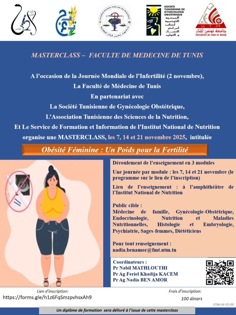 27 Oct Masterclass : Obésité et infertilité Publié à 17:20h in Actualités, Evènement, Masterclass sep/nov par FMT Share La faculté de médecine de Tunis organise une masterclass intitulée :Obésité et infertilité. Les inscriptions se font via le qr code sur l’affiche