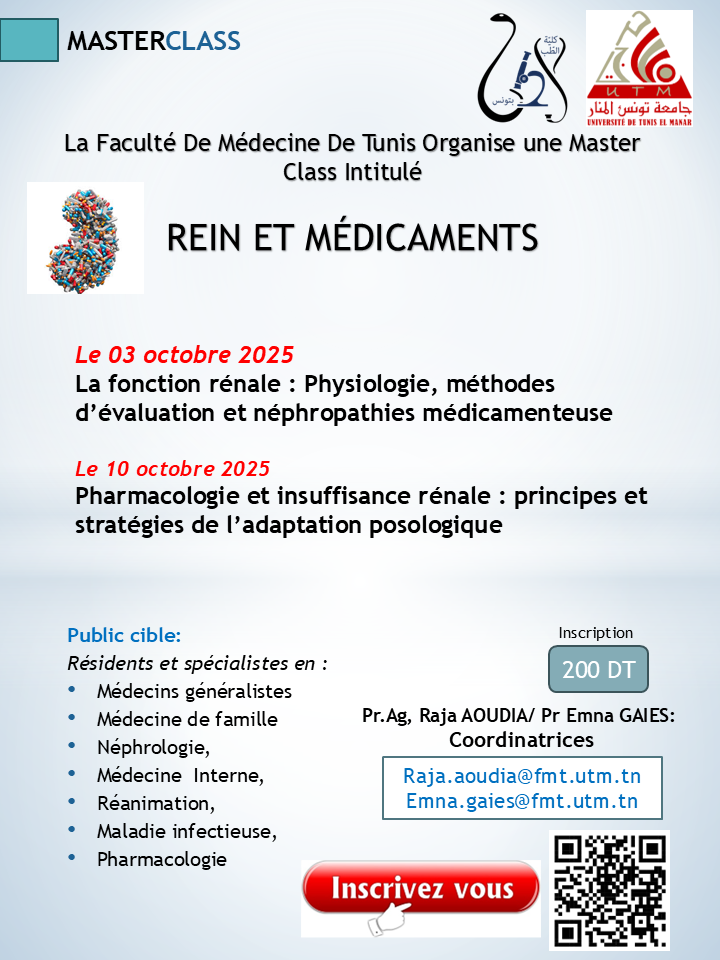 24 Sep Masterclass Rein et médicaments Publié à 09:09h in Actualités, Evènement, Masterclass sep/nov par FMT Share LA faculté de médecine de Tunis organise une maserclass intitulée « Rein et médicaments ». Les inscriptions se font en scannant le qr code sur l’affiche