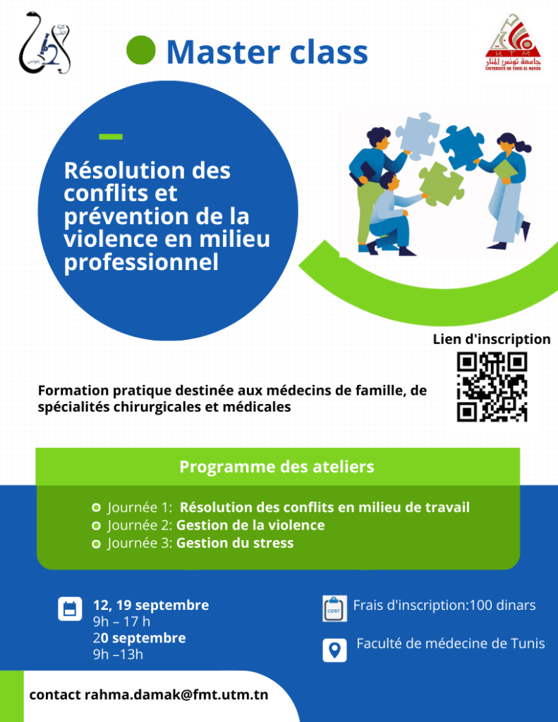 La faculté de médecine de Tunis organise une masterclass intitutlée : « Résolution des conflits et prévention de la violence en milieu professionnel« .