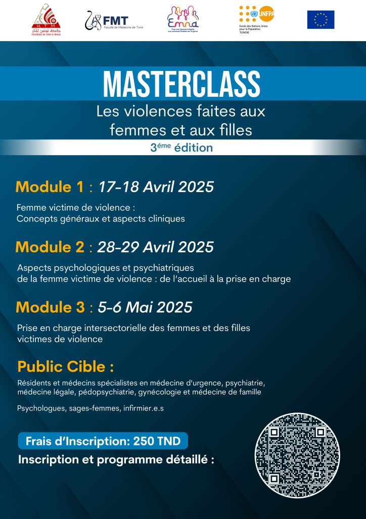 La Faculté de Médecine de Tunis, avec l’appui du Fond des Nations Unies pour la Population (UNFPA-Tunisie) en co-lead avec la Délégation de l’Union Européenne en Tunisie, organise une masterclass intitulée : « Violences faites aux femmes et aux filles ». Les inscriptions se font via le lien suivant : https://docs.google.com/forms/d/1F04-UWoPJrsz1eBgrgNGuyJdnN4mOsseTiJfBFJfY1w/preview