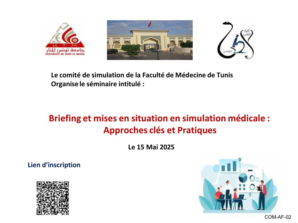 Le comité de Simulation organise son premier séminaire-atelier « Briefing et mise en situation en simulation médicale : approches clés et pratiques » à la faculté de médecine de Tunis, le 15 MAI 2025.