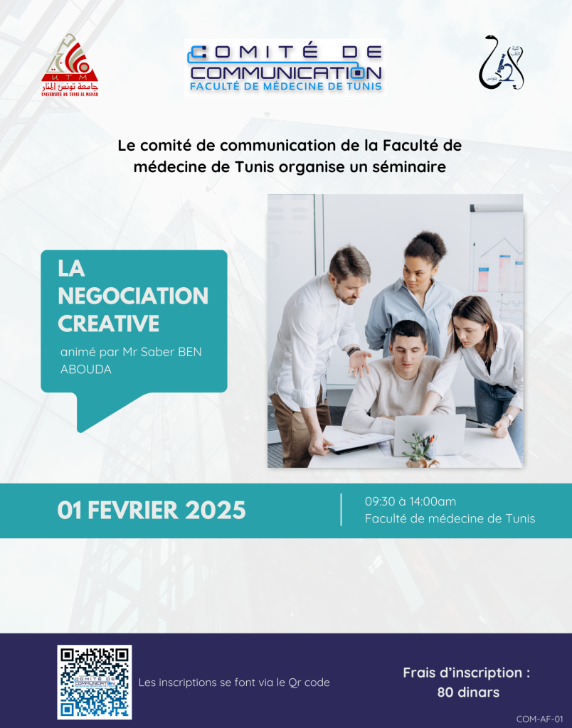 Le comité de communication organise un séminaire intitulé « La négociation créative ». Ce séminaire est animé par Mr Sabeur BEN ABOUDA. Il aura lieu le 01 Fevrier 2025.