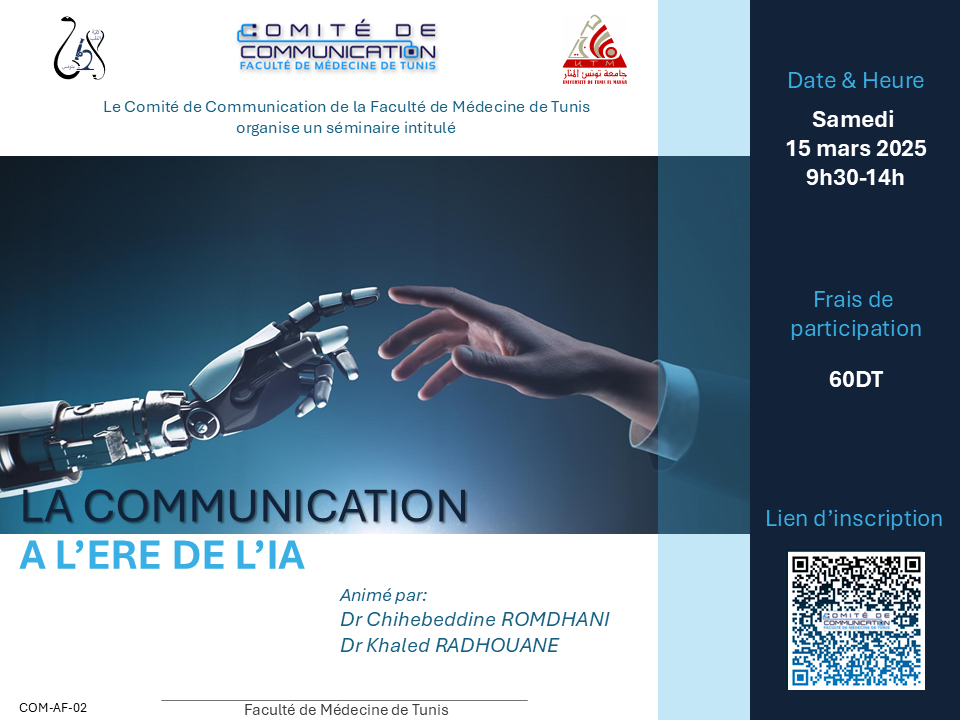 Le comité de communication de la faculté de médecine de Tunis organise un séminaire sur lintitulé : « La communication à l’ère de l’intelligence artificielle » qui sera animé par Dr Chibeddine Romdhani et Dr Khaled Radhouane. Ce séminaire aura lieu le 15 Mars 2025.