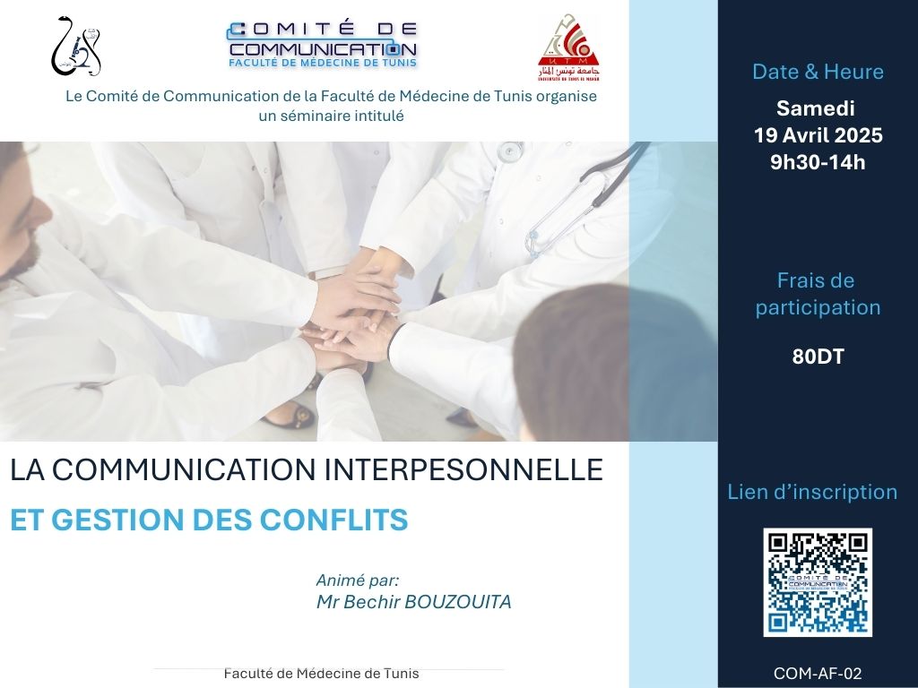 Le comité de communication de la faculté de médecine de Tunis organise un séminaire intitulé : « La communication interpersonnelle et la gestion des conflits » qui sera animé par Mr Bechir BOUZOUITA. Ce séminaire aura lieu le 19 Avril 2025.