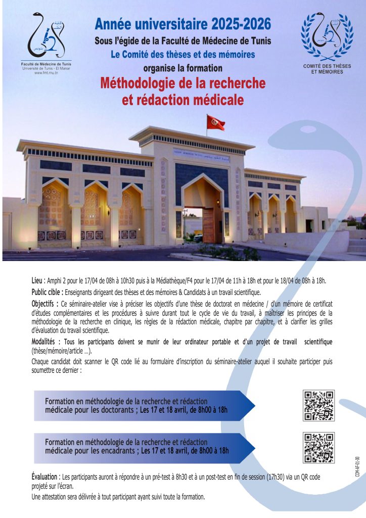 Le Comité des Thèses et Mémoires de la Faculté de Médecine de Tunis organise une nouvelle session de formation destinée Enseignants dirigeant des thèses et des mémoires & Candidats à un travail scientifique