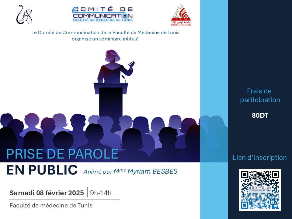 Le comité de communication de la faculté de médecine de Tunis organise un séminaire sur la prise de parole en public animé par Mme Myriam Besbes. Ce séminaire aura lieu le 08 Février 2025.