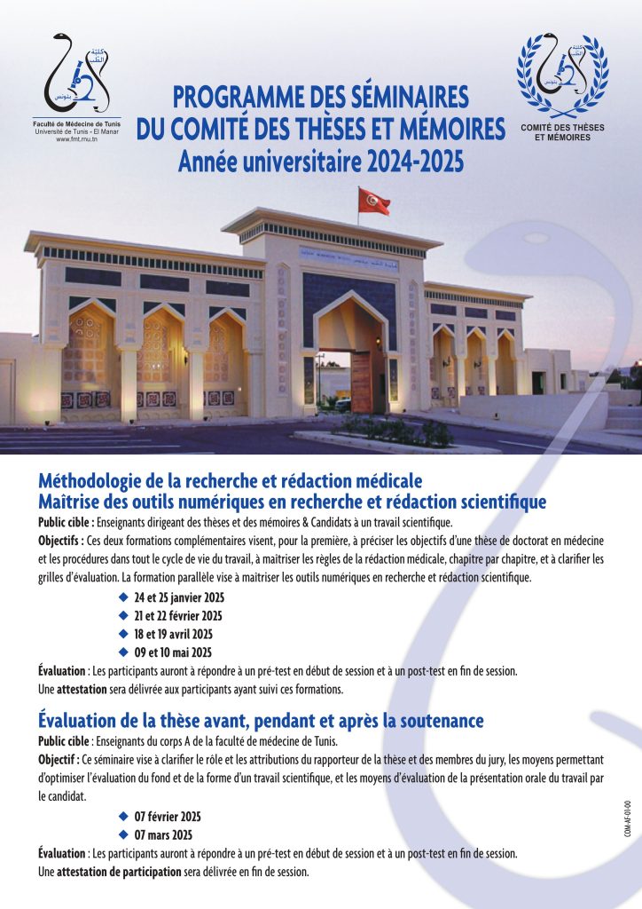 Le comité des thèses et mémoires organise une série de séminaires destinés aux encadrants et aux doctorants selon le planning ci-dessous. Les liens d’inscription seront diffusés ultérieurement